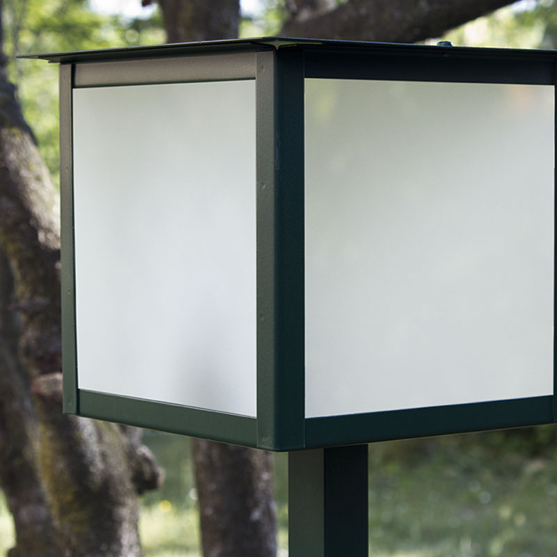 Baliza Cubus 502, baliza para jardín pintado con pintura poliester 100%, y polimerizado a 210ºC para garantizar una máxima durabilidad de oxidación en ambientes salinos. IP-44. Baliza de exterior de alta calidad, indicada para jardines, hoteles, casas de turismo rural y campings.
