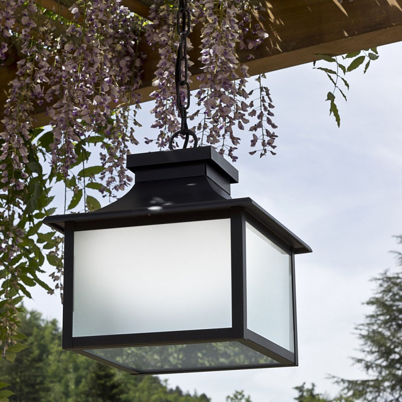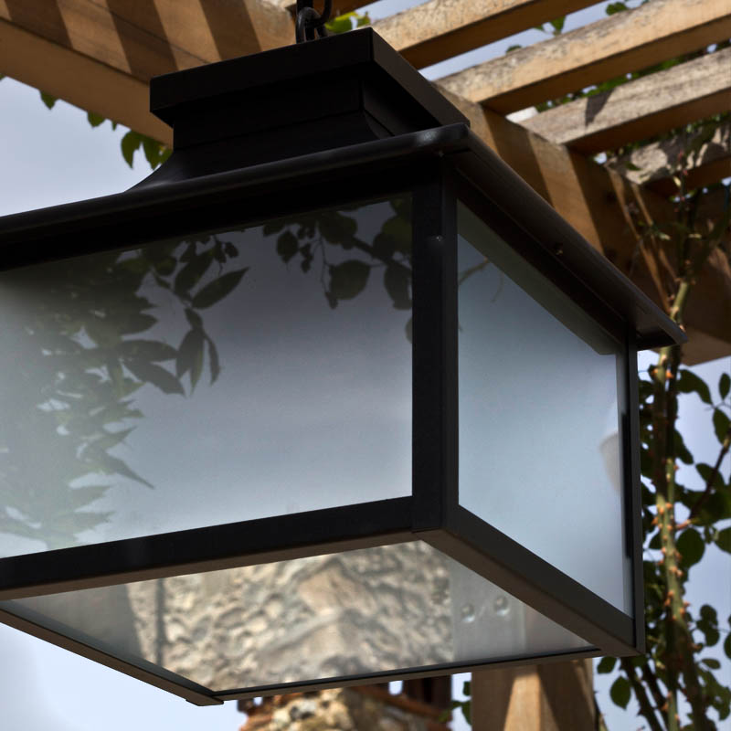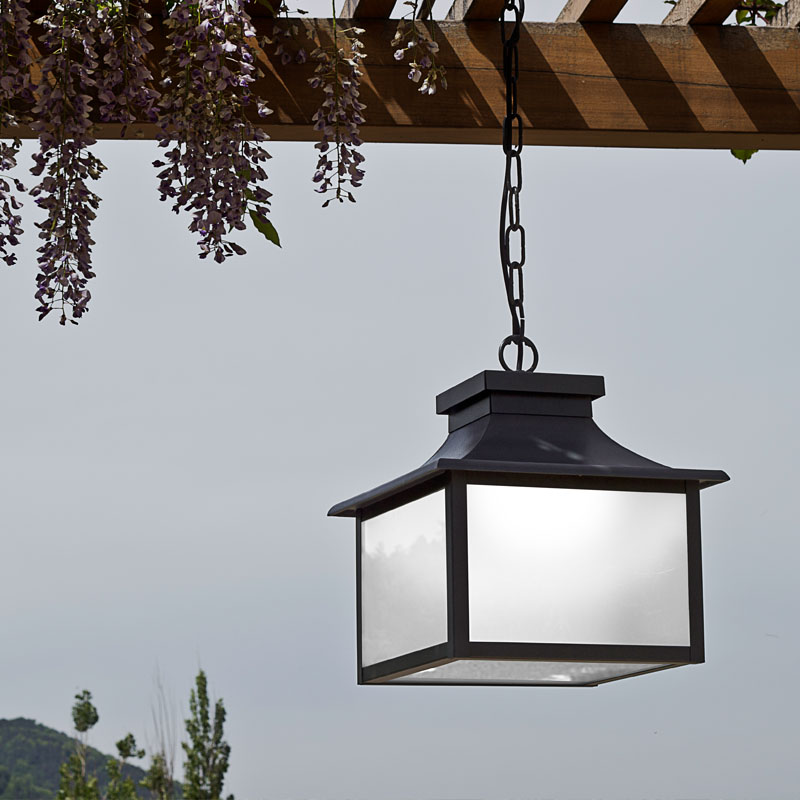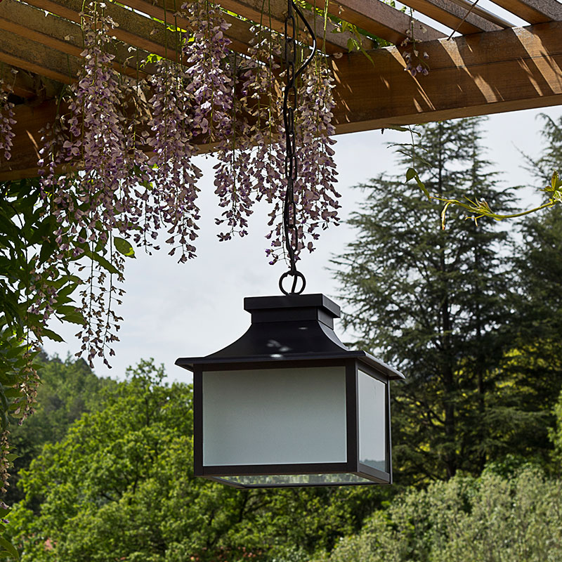 Colgante de techo para exterior Domus 403, lámpara para jardín pintado con pintura poliester 100%, y polimerizado a 210ºC para garantizar una máxima durabilidad de oxidación en ambientes salinos.