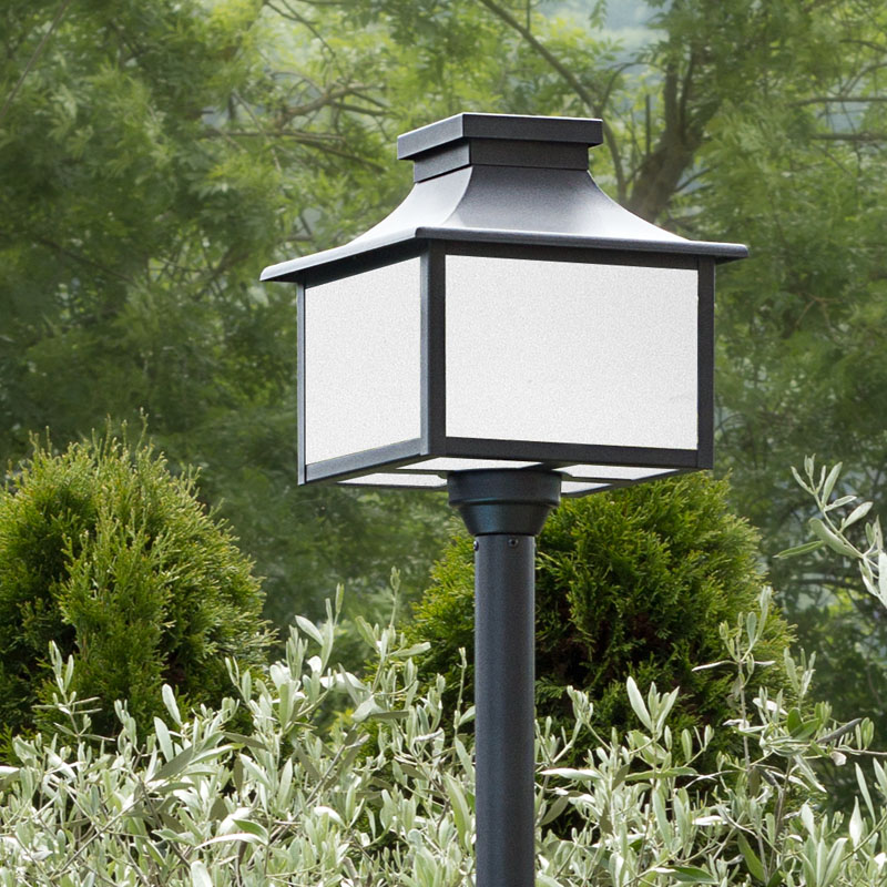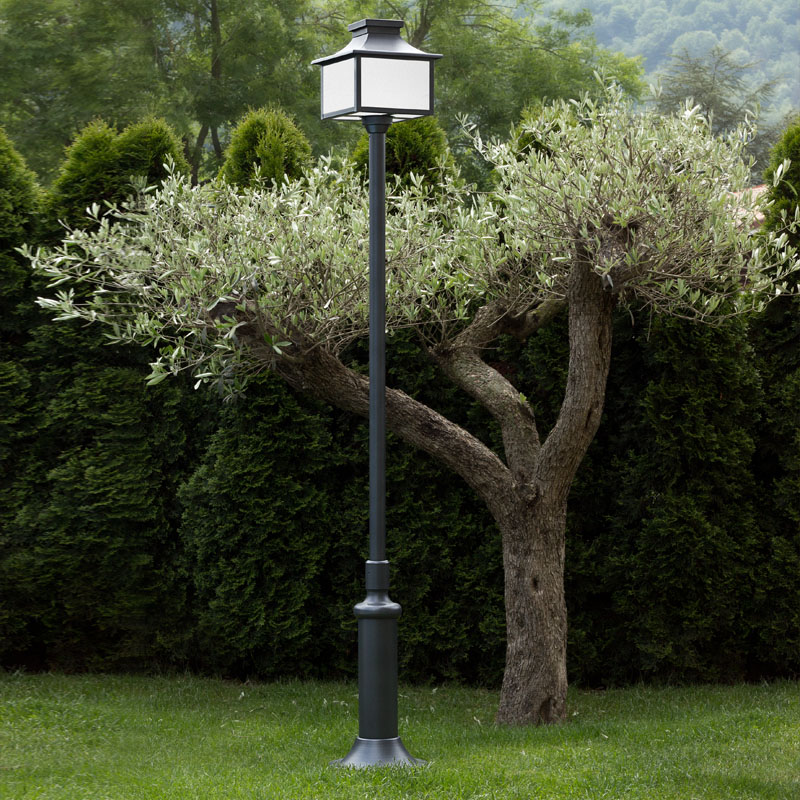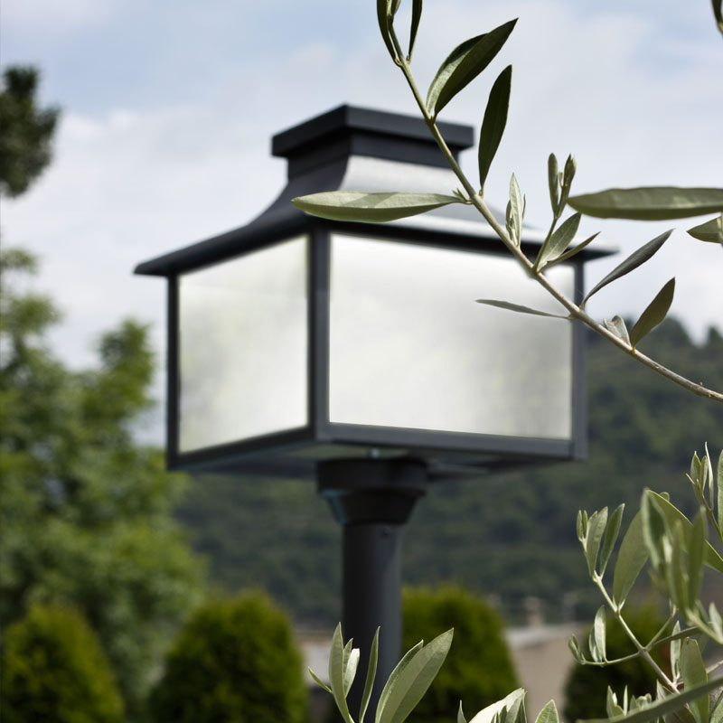 Farola de jardín Domus 504, lámpara para jardín pintado con pintura poliester 100%, y polimerizado a 210ºC para garantizar una máxima durabilidad de oxidación en ambientes salinos. IP-44. Lámpara de jardín de alta calidad, indicada para jardines, hoteles, casas de turismo rural y campings. Disponible en varios acabados y cristales.